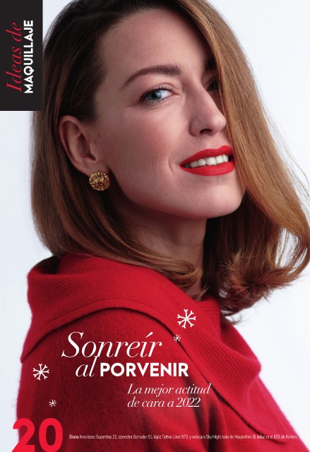 Ideas de MAQUILLAJE Sonreír al PORVENIR La mejor actitud de cara a 2022 20 Diana lleva base Superstay 21, corrector Borrador 01, lápiz Tattoo Liner 973, y máscara Sky High; todo de Maybelline. El labial es el 625 de Revlon.