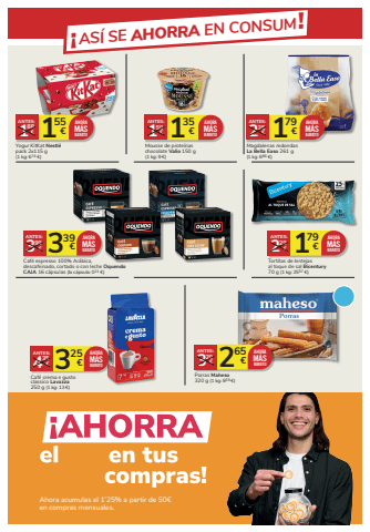 Ahora acumulas el 1%u201925% a partir de 50%u20ac en compras mensuales.179 2 %u20ac 29%u20acANTES:Tortitas de lentejas al toque de sal Bicentury70 g (1 kg: 2557 %u20ac)AHORAM%u00c1SBARATO%u00a1AS%u00cd SE AHORRA EN CONSUM!179 2 %u20ac 35%u20acANTES:Magdalenas redondas La Bella Easo 261 g(1 kg: 686 %u20ac)AHORAM%u00c1S 1 BARATO35 1 %u20ac 59%u20acANTES:Mousse de prote%u00ednaschocolate Valio 150 g(1 kg: 9 %u20ac)AHORAM%u00c1S 1 BARATO55 1 %u20ac 88%u20acANTES:Yogur KitKat Nestl%u00e9pack 2x115 g (1 kg: 674 %u20ac)AHORAM%u00c1SBARATO265 3 %u20ac 29%u20acANTES:Porras Maheso320 g (1 kg: 828 %u20ac)AHORAM%u00c1S 3 BARATO25 4 %u20ac 35%u20acANTES:Caf%u00e9 crema e gusto classico Lavazza 250 g (1 kg: 13 %u20ac)AHORAM%u00c1SBARATO339 3 %u20ac 99%u20acANTES:Caf%u00e9 espresso 100% Ar%u00e1bica, descafeinado, cortado o con leche Oquendo CAJA 16 c%u00e1psulas (la c%u00e1psula: 021 %u20ac)AHORAM%u00c1SBARATO
