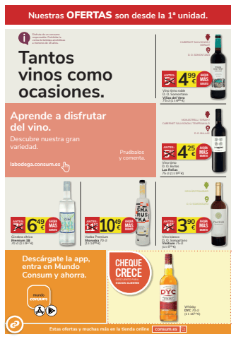 Desc%u00e1rgate la app, entra en Mundo Consum y ahorra.Nuestras OFERTAS son desde la 1%u00aa unidad.649 7 %u20ac 49%u20acANTES:Ginebra c%u00edtrica Premium 3870 cl (1 l: 927 %u20ac)AHORAM%u00c1SBARATO499 5 %u20ac 99%u20acANTES:Vino tinto robleD. O. SomontanoVi%u00f1as del Vero75 cl (1 l: 665 %u20ac)AHORAM%u00c1SBARATOCABERNET SAUVIGNON /MERLOTD. O. SOMONTANOWhiskyDYC 70 cl(1 l: 1614 %u20ac)1049 11 %u20ac 50%u20acANTES:Vodka PremiumSharuska 70 cl(1 l: 1499 %u20ac)AHORAM%u00c1SBARATO 390 4 %u20ac 65%u20acANTES:Vino blancoD. O. SomontanoVinitium 75 cl (1 l: 520 %u20ac)AHORAM%u00c1SBARATOGEW%u00dcRZTRAMINERD. O. SOMONTANODisfruta de un consumo responsable. Prohibida la venta de bebidas alcoh%u00f3licas a menores de 18 a%u00f1os.Descubre nuestra granvariedad.Aprende a disfrutardel vino.labodega.consum.esPru%u00e9balosy comenta.Tantos vinos como ocasiones.DESCUENTO PARASOCIOS-CLIENTESCHEQUE CRECEEstas ofertas y muchas m%u00e1s en la tienda online consum.esMONASTRELL / SYRAH / CABERNET SAUVIGNON / TEMPRANILLOD. O. BULLAS425 5 %u20ac 89%u20acANTES:Vino tintoD. O. BullasLas Re%u00f1as75 cl (1 l: 567 %u20ac)AHORAM%u00c1SBARATO