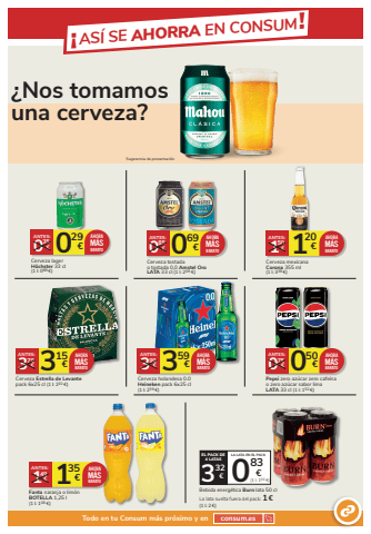 %u00a1AS%u00cd SE AHORRA EN CONSUM!%u00bfNos tomamos una cerveza?050 0 %u20ac 75%u20acANTES:Pepsi zero az%u00facar zero cafe%u00edna o zero az%u00facar sabor limaLATA 33 cl (1 l: 152 %u20ac)AHORAM%u00c1SBARATO135 1 %u20ac 49%u20acANTES:Fanta naranja o lim%u00f3nBOTELLA 1,25 l (1 l: 108 %u20ac)AHORAM%u00c1SBARATO359 3 %u20ac 99%u20acANTES:Cerveza holandesa 0.0Heineken pack 6x25 cl (1 l: 239 %u20ac)AHORAM%u00c1SBARATO069 0 %u20ac 85%u20acANTES:Cerveza tostada o tostada 0,0 Amstel Oro LATA 33 cl (1 l: 209 %u20ac)AHORAM%u00c1SBARATO 120 1 %u20ac 50%u20acANTES:Cerveza mexicana Corona 355 ml(1 l: 338 %u20ac)AHORAM%u00c1S 0 BARATO29 0 %u20ac 35%u20acANTES:Cerveza lager H%u00f6chster 33 cl(1 l: 088 %u20ac)AHORAM%u00c1SBARATOSugerencia de presentaci%u00f3nTodo en tu Consum m%u00e1s pr%u00f3ximo y en consum.es315 3 %u20ac 79%u20acANTES:Cerveza Estrella de Levantepack 6x25 cl (1 l: 210 %u20ac)AHORAM%u00c1SBARATOBebida energ%u00e9tica Burn lata 50 clLa lata suelta fuera del pack: 1%u20ac(1 l: 2 %u20ac)EL PACK DE4 LATASLA LATA EN EL PACK0(1 l: 166 %u20ac)83 3 %u20ac 32%u20ac
