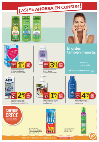 Cereales con doble chocolate Fitness Nestl%u00e9375g (1 kg: 600 %u20ac)070%u20acACUMULACereales con doble chocolate Fitness Nestl%u00e9 375g (1 kg: 600 %u20ac)0%u20ac 425%u20acP.V.P.OGX 300ML %u00a1AS%u00cd SE AHORRA EN CONSUM!Mejora turutina facial.El orden tambi%u00e9n importa.Todo en tu Consum m%u00e1s pr%u00f3ximo y en consum.es229 2 %u20ac 55%u20acANTES:Maquinilla desechable Premium 3 hojas Lea4 unidades (la unidad: 057 %u20ac)AHORAM%u00c1SBARATO165 2 %u20ac 05%u20acANTES:Protegeslip Flexiform sin fragancia Carefree 30 uds. (la unidad: 006 %u20ac)AHORAM%u00c1SBARATO420 4 %u20ac 95%u20acANTES:Body milk nutritivo piel seca Nivea 400 ml(100 ml: 105 %u20ac)AHORAM%u00c1SBARATO315 3 %u20ac 95%u20acANTES:Desmaquillante ojos 2 en 1 Garnier 125 ml (100 ml: 252 %u20ac)AHORAM%u00c1SBARATOEspuma nutri rizosFructis 300 ml(100 ml: 116 %u20ac)Cepillo dental Extra Clean Colgate 2+2 unidades gratis(la unidad: 075 %u20ac)DESCUENTO PARASOCIOS-CLIENTESCHEQUE CRECE195 2 %u20ac 19%u20acANTES:Jab%u00f3n de manos coco y mango Vitarelle 500 ml(100 ml: 039 %u20ac)AHORAM%u00c1SBARATOTodo en tu Consum m%u00e1s pr%u00f3ximo y en consum.escuidarnos.consum.es