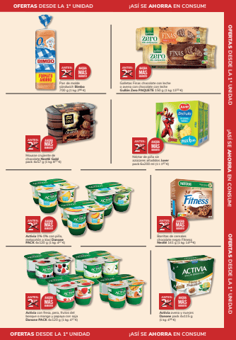 239%u20acANTES:Mousse crujiente de chocolate Nestl%u00e9 Gold pack 4x57 g (1 kg: 877 %u20ac)AHORA M%u00c1SBARATO 299%u20acANTES:N%u00e9ctar de pi%u00f1a sin az%u00facares a%u00f1adidos Juver pack 6x200 ml (1 l: 167 %u20ac)AHORA M%u00c1SBARATO%u00a1AS%u00cd SE AHORRA EN CONSUM!%u00a1AS%u00cd SE AHORRA EN CONSUM!%u00a1AS%u00cd SE AHORRA EN CONSUM!OFERTAS DESDE LA 1%u00aa UNIDADOFERTAS DESDE LA 1%u00aa UNIDADOFERTAS DESDE LA 1%u00aa UNIDAD OFERTAS DESDE LA 1%u00aa UNIDAD265%u20acANTES:Galletas Finas chocolate con leche o avena con chocolate con lecheGull%u00f3n Zero PAQUETE 150 g (1 kg: 1333 %u20ac)AHORA M%u00c1SBARATO299%u20acANTES:Barritas de cereales chocolate negro Fitness Nestl%u00e9 141 g (1 kg: 1418 %u20ac)AHORA M%u00c1SBARATO235%u20acANTES:Activia con fresa, pera, frutos del bosque o mango y papaya con soja Danone PACK 4x120 g (1 kg: 417 %u20ac)AHORA M%u00c1SBARATO235%u20acANTES:Activia 0% 0% con pi%u00f1a,melocot%u00f3n o kiwi Danone PACK 4x120 g (1 kg: 417 %u20ac)AHORA M%u00c1SBARATO264%u20acANTES:Activia avena y nueces Danone pack 4x115 g(1 kg: 435 %u20ac)AHORA M%u00c1SBARATO229%u20acANTES:Pan de molde s%u00e1ndwich Bimbo 700 g (1 kg: 286 %u20ac)AHORA M%u00c1SBARATO