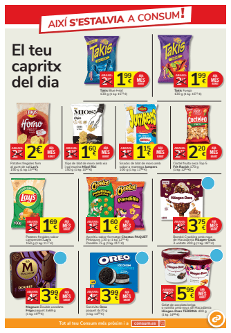 GAZPACHO ORIGINAL El teu ALVALLE 1L capritxdel dia160 1 %u20ac 90%u20acABANS:Xips de blat de moro amb xiai sal marina Mios! Risi150 g (1 kg: 1067 %u20ac)ARAM%u00c9SBARAT 115 1 %u20ac 40%u20acABANS:Snacks de blat de moro amb sabor a mantega Jumpers100 g (1 kg: 1150 %u20ac)ARAM%u00c9SBARAT160 1 %u20ac 89%u20acABANS:Aperitiu sabor formatge Cheetos PAQUETPelotazos 130 g (1 kg: 1231 %u20ac)Pandilla 75 g (1 kg: 2133 %u20ac)ARAM%u00c9S 1 BARAT69 1 %u20ac 99%u20acABANS:Patates fregides sabor camperoles Lay%u2019s150 g (1 kg: 1127 %u20ac)ARAM%u00c9SBARAT2%u20ac 239%u20acABANS:Patates fregides fornal punt de sal Lay%u2019s150 g (1 kg: 1333 %u20ac)ARAM%u00c9SBARAT399 4 %u20ac 99%u20acABANS:Magnum Double xocolata Frigo paquet 3x69 g(1 kg: 1928 %u20ac)ARAM%u00c9SBARAT199 2 %u20ac 25%u20acABANS:Takis Blue Heat 130 g (1 kg: 1531 %u20ac)ARAM%u00c9SBARAT399 4 %u20ac 99%u20acABANS:Sandvitx Oreopaquet 4x70 g(1 kg: 1425 %u20ac)ARAM%u00c9SBARAT 595 7 %u20ac 29%u20acABANS:Gelat de xocolata belgao vainilla amb nous de Macad%u00e0mia H%u00e4agen-Dazs TERRINA 400 g(1 kg: 1488 %u20ac)ARAM%u00c9SBARAT199 2 %u20ac 25%u20acABANS:Takis Fuego 130 g (1 kg: 1531 %u20ac)ARAM%u00c9SBARAT375 4 %u20ac 99%u20acABANS:Bomb%u00f3 Cracking amb nousde Macad%u00e0mia H%u00e4agen-Dazs 3 unitats 200 g (1 kg: 1875 %u20ac)ARAM%u00c9SBARAT220 2 %u20ac 75%u20acABANS:C%u00f2ctel fruita seca Top 5Frit Ravich 170 g(1 kg: 1294 %u20ac)ARAM%u00c9SBARATAIX%u00cd S%u2019ESTALVIA A CONSUM!Tot al teu Consum m%u00e9s pr%u00f2xim i a consum.es