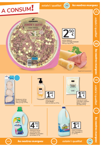 Rodanxes de llu%u00e7del Cap Consum360 g (1 kg: 1108 %u20ac)140%u20acSab%u00f3 de manscivada Kyrey500 ml (100 ml: 028 %u20ac)130%u20acEsponja de banymassatge-exfoliant Kyrey 2 unitats(la unitat: 065 %u20ac)470%u20acDetergent l%u00edquid concentrat color Consum 52 rentades (la rentada: 009 %u20ac)125%u20acLleixiu rentadoradens Consum 2 l(1 l: 063 %u20ac)250%u20acPIZZA FRESCApernil i formatge Consum400 g (1 kg: 625 %u20ac)Suggeriment de presentaci%u00f3estalvi i qualitatestalvi i qualitat estalvi i qualitatestalvi i qualitatA CONSUM!