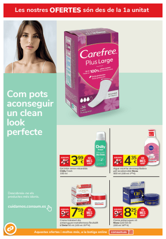 Com pots aconseguir un clean look perfecteDescobreix-ne els productes m%u00e9s idonis.cuidarnos.consum.es435 4 %u20ac 99%u20acABANS:Aigua micel%u00b7lar desmaquilladora pell seca/sensible Nivea400 ml (100 ml: 109 %u20ac)ARAM%u00c9SBARAT825 9 %u20ac 59%u20acABANS:Crema antiarrugues nitNivea Q10 50 ml (100 ml: 1650 %u20ac)ARAM%u00c9SBARAT399 4 %u20ac 99%u20acABANS:Gel %u00edntim sense esbandidaChilly Fresh 100 mlARAM%u00c9SBARAT759 9 %u20ac 50%u20acABANS:Crema hidratant dia antiarrugues+extrafermesa Revitalift L%u2019Or%u00e9al 50 ml (100 ml: 1518 %u20ac)ARAM%u00c9SBARATLes nostres OFERTES s%u00f3n des de la 1a unitatAquestes ofertes i moltes m%u00e9s, a la botiga online consum.es
