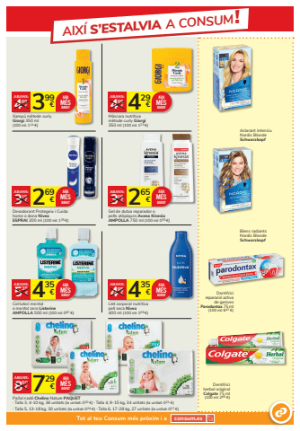 Blens radiants Nordic Blonde SchwarzkopfAclarant intensiu Nordic Blonde SchwarzkopfDentifricireparaci%u00f3 activa de genives Parodontax 75 ml (100 ml: 647 %u20ac)Dentifrici herbal original Colgate 75 ml (100 ml: 265 %u20ac)435 5 %u20ac 35%u20acABANS:Col%u00b7lutori mentol o mentol zero ListerineAMPOLLA 500 ml (100 ml: 087 %u20ac)ARAM%u00c9SBARAT399 4 %u20ac 69%u20acABANS:Xamp%u00fa m%u00e8tode curly Giorgi 350 ml (100 ml: 114 %u20ac)ARAM%u00c9SBARAT435 4 %u20ac 95%u20acABANS:Llet corporal nutritiva pell seca Nivea400 ml (100 ml: 109 %u20ac)ARAM%u00c9SBARAT429 4 %u20ac 95%u20acABANS:M%u00e0scara nutritiva m%u00e8tode curly Giorgi350 ml (100 ml: 123 %u20ac)ARAM%u00c9SBARAT265 3 %u20ac 05%u20acABANS:Gel de dutxa reparador opells at%u00f2piques Avena Kinesia AMPOLLA 750 ml (100 ml: 035 %u20ac)ARAM%u00c9S 2 BARAT69 3 %u20ac 15%u20acABANS:Desodorant Protegeix i Cuida home o dona Nivea ESPRAI 200 ml (100 ml: 135 %u20ac)ARAM%u00c9SBARAT729 8 %u20ac 50%u20acABANS:Pa%u00f1al nad%u00f3 Chelino Nature PAQUET%u00b7 Talla 3, 4-10 kg, 36 unitats (la unitat: 020 %u20ac) %u00b7 Talla 4, 9-15 kg, 34 unitats (la unitat: 021 %u20ac)%u00b7 Talla 5, 13-18 kg, 30 unitats (la unitat: 024 %u20ac) %u00b7 Talla 6, 17-28 kg, 27 unitats (la unitat: 027 %u20ac)ARAM%u00c9SBARATAIX%u00cd S%u2019ESTALVIA A CONSUM!Tot al teu Consum m%u00e9s pr%u00f2xim i a consum.es