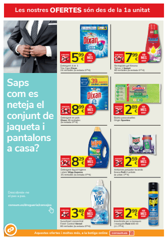 Saps com es neteja el conjunt de jaqueta i pantalons a casa?Descobreix-neel pas a pas.consum.es/drogueria/consejos259 3 %u20ac 75%u20acABANS:Antiarnes penjador lavanda fresca Polil 2 unitats(la unitat: 130 %u20ac)ARAM%u00c9SBARAT289 3 %u20ac 50%u20acABANS:Baieta posavaixellesOrigin SpontexARAM%u00c9SBARAT299 3 %u20ac 99%u20acABANS:Insecticida per a mosques i mosquits Raid 400 ml(1 l: 748 %u20ac)ARAM%u00c9SBARAT599 8 %u20ac 79%u20acABANS:Detergent 4 en 1 Trio Caps Dixan24 rentades (la rentada: 025 %u20ac)ARAM%u00c9SBARAT349 4 %u20ac 55%u20acABANS:Suavitzant concentrat Fresh Control Vernel80 rentades (la rentada: 004 %u20ac)ARAM%u00c9SBARAT829 12 %u20ac 19%u20acABANS:Detergent l%u00edquid higiene i olors Wipp Express35 rentades (la rentada: 024 %u20ac)ARAM%u00c9SBARAT799 10 %u20ac 69%u20acABANS:Rentaplats gel llimona Tot en 1 Somat60 rentades (la rentada: 013 %u20ac)ARAM%u00c9SBARAT899 11 %u20ac 15%u20acABANS:Detergent en polsDixan 39 rentades (la rentada: 023 %u20ac)ARAM%u00c9SBARATLes nostres OFERTES s%u00f3n des de la 1a unitatAquestes ofertes i moltes m%u00e9s, a la botiga online consum.es