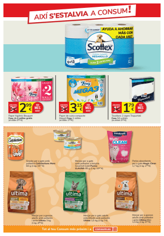 299 3 %u20ac 89%u20acABANS:Paper higi%u00e8nic BouquetFoxy 4+2 rotlles gratis(el rotlle: 050 %u20ac)ARAM%u00c9SBARAT 315 3 %u20ac 75%u20acABANS:Paper de cuina compacte Mega3 Foxy 2 rotlles(el rotlle: 158 %u20ac)ARAM%u00c9SBARAT 179 1 %u20ac 99%u20acABANS:Tovallons 2 capes Trapuntati Foxy 50 unitats(la unitat: 004 %u20ac)ARAM%u00c9SBARATSnacks per a gats amb pollastre Catisfactions Mars60 g (1 kg: 3317 %u20ac)Perles absorbents per a gats Magic Clean1,7 kg (1 kg: 279 %u20ac)Menjar per a gossosadults amb pollastre i arr%u00f2s Ultima Mini 1,5 kg (1 kg: 533 %u20ac)Menjar per a gatsamb pollastre o tonyinaGourmet Gold Purina LLAUNA 85 g (1 kg: 1047 %u20ac)Menjar per a gossosadults amb pollastrei arr%u00f2s Ultima 3 kg(1 kg: 448 %u20ac)Menjar per a gats adultsesterilitzats amb pollastreUltima 1,5 kg (1 kg: 7 %u20ac)AIX%u00cd S%u2019ESTALVIA A CONSUM!Tot al teu Consum m%u00e9s pr%u00f2xim i a consum.es