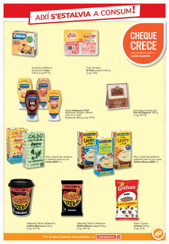 Yakisoba Cl%u00e0ssic Yatekomo Gallina Blanca got 93 g(1 kg: 2097 %u20ac)Yakisoba Cl%u00e0ssic Yatekomo Gallina Blanca paquet 93 g(1 kg: 1602 %u20ac)Brou casol%u00e0 de pollastre,pollastre baix en sal o peixGallina Blanca BRIC 1 lPipes Tijuana Grefusa 240 g(1 kg: 10 %u20ac)Formatge d%u2019ovella vell Flor de Esgueva 250 g (1 kg: 2492 %u20ac)Salsa Hellmann%u2019s POTMostassa, Burger o Brava250 ml (1 l: 9 %u20ac)Barbacoa 285 g (1 kg: 789 %u20ac)Amanida Calif%u00f2rniade tonyina Calvo150 g (1 kg: 967 %u20ac)Tires de bac%u00f3 El Pozo paquet 2x50 g(1 kg: 15 %u20ac)Brou natural de verdures o pollastre baix en sal Aneto BRIC 1 lAIX%u00cd S%u2019ESTALVIA A CONSUM!Tot al teu Consum m%u00e9s pr%u00f2xim i a consum.esCHEQUE CRECEDESCOMPTE PER A SOCIS CLIENTS