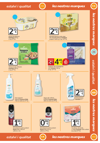 estalvi i qualitatestalvi i qualitatestalvi i qualitat225%u20acSorbet de llimona Consum 570 g (1 kg: 395 %u20ac)285%u20acBomb%u00f3 llimona amb capa de xocolata blanca Consumpaquet 3x63 g (1 kg: 1508 %u20ac)270%u20acTempura de verduresConsum 400 g(1 kg: 675 %u20ac)199%u20acDesodorant extra protect Kyrey Men 200 ml (100 ml: 1 %u20ac)099%u20acDesodorant extra protect Kyrey Men 50 ml (100 ml: 198 %u20ac)210%u20acNetejadutxes Consum 1 l185%u20acTovallons decorats 1 capa Consum 100 unitats (la unitat: 002 %u20ac)449 4 %u20ac 99%u20acABANS:Calamar de la Patag%u00f2nia net Consum 360 g(1 kg: 1247 %u20ac)ARAM%u00c9SBARATAigua de col%u00f2nia infantil Consum Kids 200 ml (100 ml: 085 %u20ac)Gel corporalinfantil Consum Kids 750 ml (100 ml: 033 %u20ac)