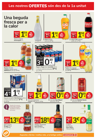 3%u20ac 499%u20acABANS:Vi blancDO RuedaPata Negra75 cl (1 l: 4 %u20ac)ARAM%u00c9SBARATVERDEJODO RUEDAUna beguda fresca per a la calor158 1 %u20ac 72%u20acABANS:Coca-Cola original1,25 l (1 l: 126 %u20ac)ARAM%u00c9SBARAT165 1 %u20ac 85%u20acABANS:Fanta Zero taronjao llimona AMPOLLA 2 l(1 l: 083 %u20ac)ARAM%u00c9SBARAT1350 15 %u20ac 95%u20acABANS:Rom anyenc Brugal 70 cl(1 l: 1929 %u20ac)ARAM%u00c9SBARAT 1899 23 %u20ac 25%u20acABANS:Whisky TennesseeJack Daniel%u2019s70 cl (1 l: 2713 %u20ac)ARAM%u00c9SBARATLes nostres OFERTES s%u00f3n des de la 1a unitatAquestes ofertes i moltes m%u00e9s, a la botiga online consum.esGaudeix d%u2019un consum responsable. Prohibidala venda de begudes alcoh%u00f2liques a menorsde 18 anys.130 1 %u20ac 69%u20acABANS:Trina taronja 1,5 l (1 l: 087 %u20ac)ARAM%u00c9SBARATPepsi o Pepsi Zero LLAUNA 33 clLa llauna solta fora del pack: 050 %u20ac(1 l: 152 %u20ac)EL PACK DE8 LLAUNESLA LLAUNA EN EL PACK0(1 l: 148 %u20ac)49 3 %u20ac 92%u20acBeguda energ%u00e8tica Red Bull llauna 25 clLa llauna solta fora del pack: 163 %u20ac(1 l: 652 %u20ac)EL PACK DE4 LLAUNESLA LLAUNA EN EL PACK1(1 l: 436 %u20ac)09 4 %u20ac 36%u20ac159 1 %u20ac 99%u20acABANS:T%u00f2nica original Schweppes 1 lARAM%u00c9SBARAT120 1 %u20ac 49%u20acABANS:Cervesa mexicana Corona 355 ml (1 l: 338 %u20ac)ARAM%u00c9SBARAT 050 0 %u20ac 74%u20acABANS:Cervesa San Miguel33 cl (1 l: 152 %u20ac)ARAM%u00c9SBARAT 069 0 %u20ac 87%u20acABANS:Cervesa Estrella Damm33 cl (1 l: 209 %u20ac)ARAM%u00c9SBARAT149 1 %u20ac 99%u20acABANS:Nestea llimona o llimona sense sucre AMPOLLA 1,5 l (1 l: 099 %u20ac)ARAM%u00c9SBARAT