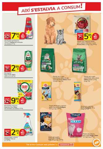 229 2 %u20ac 69%u20acABANS:Netejavidres cristal%u00b7l%u00ed Cristasol 750 ml (1 l: 305 %u20ac)ARAM%u00c9SBARAT299 3 %u20ac 85%u20acABANS:Rentaplats Maxi Poder Fairy450 ml (1 l: 664 %u20ac)ARAM%u00c9SBARAT585 7 %u20ac 19%u20acABANS:Menjar per a gossos adultsraces petites amb bou i arr%u00f2sPurina One 1,5 kg (1 kg: 390 %u20ac)ARAM%u00c9S 7 BARAT99 10 %u20ac 69%u20acABANS:Rentaplats gel llimonaTot en 1 Somat 60 rentades(la rentada: 013 %u20ac)ARAM%u00c9SBARAT999 12 %u20ac 99%u20acABANS:Rentaplats m%u00e0quina Platinum Plus Fairy40 rentades (la rentada: 025 %u20ac)ARAM%u00c9SBARATSnack per a gatsParty Mix Original Felix 60 g (1 kg: 3250 %u20ac)Menjar per a gatsesterilitzats amb salm%u00f3Ultima Adult 1,5 kg (1 kg: 7 %u20ac)Menjar per a gatsesterilitzats boles de p%u00e8lamb gall dindi Ultima Adult1,5 kg (1 kg: 7 %u20ac)Perles absorbents per a gats Magic Clean1,7 kg (1 kg: 279 %u20ac)Snack dental per a gossospetits Dentastix Pedigree110 g (1 kg: 1809 %u20ac)Snack per a gossosRodeo Pedigree 70 g(1 kg: 2129 %u20ac)AIX%u00cd S%u2019ESTALVIA A CONSUM!Tot al teu Consum m%u00e9s pr%u00f2xim i a consum.es