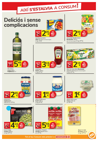 549 7 %u20ac 99%u20acABANS:Oli d%u2019oliva verge extra Hojiblanca 1 lARAM%u00c9SBARATDelici%u00f3s i sense complicacions424 5 %u20ac 19%u20acABANS:Faves baby Findus 400 g(1 kg: 1060 %u20ac)ARAM%u00c9SBARAT219 2 %u20ac 59%u20acABANS:Blat de moro dol%u00e7 Bonduellepaquet 3x70 g (pes net escorregut)(1 kg: 1043 %u20ac)ARAM%u00c9SBARAT299 3 %u20ac 69%u20acABANS:Amanida Mediterr%u00e0niaBonduelle 310 g(pes net escorregut) (1 kg: 965 %u20ac)ARAM%u00c9S 2 BARAT05 2 %u20ac 45%u20acABANS:Sardines picants Albo 82 g (pes net escorregut)(1 kg: 25 %u20ac)ARAM%u00c9SBARAT559 6 %u20ac 99%u20acABANS:Gaspatxo Original Alvalle paquet 2x1 l (1 l: 280 %u20ac)ARAM%u00c9SBARAT319 3 %u20ac 75%u20acABANS:Qu%u00e8txup Heinz 700 g (1 kg: 456 %u20ac)ARAM%u00c9SBARAT199 2 %u20ac 49%u20acABANS:Salsa tradicional Kraft 490 g(1 kg: 406 %u20ac)ARAM%u00c9S 2 BARAT65 2 %u20ac 95%u20acABANS:Maionesa Hellmann%u2019s450 ml (1 l: 589 %u20ac)ARAM%u00c9SBARAT 1%u20ac 135%u20acABANS:Allioli extra suauChovi 150 ml (1 l: 667 %u20ac)ARAM%u00c9SBARATBac%u00f3 en talls El Pozo 110 g (1 kg: 1364 %u20ac)AIX%u00cd S%u2019ESTALVIA A CONSUM!Tot al teu Consum m%u00e9s pr%u00f2xim i a consum.es