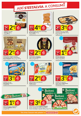 312 3 %u20ac 69%u20acABANS:Anelles a la romana sense gluten Pescanova400 g (1 kg: 780 %u20ac)ARAM%u00c9SBARAT199 2 %u20ac 55%u20acABANS:Pebrots farcits debacall%u00e0 CocinArte 240 g (1 kg: 829 %u20ac)ARAM%u00c9SBARAT249 2 %u20ac 99%u20acABANS:Tallarines al wokTa%u00b7Tung 250 g(1 kg: 996 %u20ac)ARAM%u00c9SBARAT 499 5 %u20ac 99%u20acABANS:Llibrets fregits de pernil i formatgeBo de Deb%u00f2 270 g(1 kg: 1848 %u20ac)ARAM%u00c9SBARAT 356 4 %u20ac 19%u20acABANS:Canelons de carn rostidagratinats Casa Mas 350 g(1 kg: 1017 %u20ac)ARAM%u00c9SBARAT159 1 %u20ac 87%u20acABANS:Massa de pizza rectangularFinissima Buitoni 260 g(1 kg: 612 %u20ac)ARAM%u00c9SBARAT 3%u20ac 365%u20acABANS:Pizza Forno di Pietra Buitoni PAQUETPernil i xampinyons 340 g (1 kg: 882 %u20ac) Pernil i formatge o Caprese 350 g (1 kg: 857 %u20ac)ARAM%u00c9SBARAT285 3 %u20ac 45%u20acABANS:Pasta fresca cl%u00e0ssica farcidade pollastre rostit o 4 formatges Rana PAQUET 250 g (1 kg: 1140 %u20ac)ARAM%u00c9SBARAT339 3 %u20ac 99%u20acABANS:Peskitos de llu%u00e7 Pescanova 400 g (1 kg: 848 %u20ac)ARAM%u00c9SBARAT 299 3 %u20ac 99%u20acABANS:Filets de peix amb llimonaFindus 225 g (1 kg: 1329 %u20ac)ARAM%u00c9SBARAT254 2 %u20ac 99%u20acABANS:Truita fresca casolanaamb espinacs Palacios300 g (1 kg: 847 %u20ac)ARAM%u00c9SBARATAIX%u00cd S%u2019ESTALVIA A CONSUM!Tot al teu Consum m%u00e9s pr%u00f2xim i a consum.es