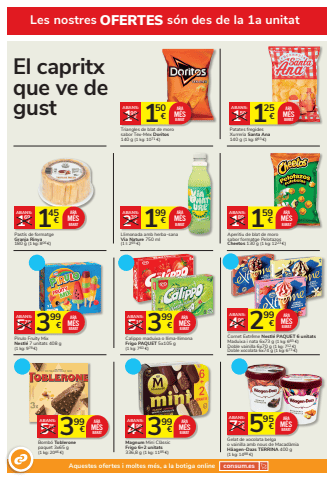 399 4 %u20ac 99%u20acABANS:Magnum Mini Cl%u00e0ssic Frigo 6+2 unitats336,8 g (1 kg: 1185 %u20ac)ARAM%u00c9S 3 BARAT99 5 %u20ac 75%u20acABANS:Bomb%u00f3 Tobleronepaquet 3x65 g(1 kg: 2046 %u20ac)ARAM%u00c9SBARAT 595 7 %u20ac 29%u20acABANS:Gelat de xocolata belgao vainilla amb nous de Macad%u00e0mia H%u00e4agen-Dazs TERRINA 400 g(1 kg: 1488 %u20ac)ARAM%u00c9SBARAT399 5 %u20ac 19%u20acABANS:Calippo maduixa o llima-llimonaFrigo PAQUET 5x105 g (1 kg: 760 %u20ac)ARAM%u00c9SBARAT 299 4 %u20ac 99%u20acABANS:Cornet Extr%u00eame Nestl%u00e9 PAQUET 6 unitatsMaduixa i nata 6x73 g (1 kg: 683 %u20ac)Doble vainilla 6x70 g (1 kg: 712 %u20ac)Doble xocolata 6x74 g (1 kg: 673 %u20ac)ARAM%u00c9SBARAT199 2 %u20ac 39%u20acABANS:Llimonada amb herba-sanaVia Nature 750 ml (1 l: 265 %u20ac)ARAM%u00c9SBARAT399 5 %u20ac 79%u20acABANS:Pirulo Fruity MixNestl%u00e9 7 unitats 408 g(1 kg: 978 %u20ac)ARAM%u00c9SBARATEl capritx que ve de gust 125 1 %u20ac 50%u20acABANS:Patates fregides Xurreria Santa Ana140 g (1 kg: 893 %u20ac)ARAM%u00c9SBARAT145 1 %u20ac 69%u20acABANS:Past%u00eds de formatgeGranja Rinya 180 g (1 kg: 806 %u20ac)ARAM%u00c9SBARAT 159 1 %u20ac 89%u20acABANS:Aperitiu de blat de morosabor formatge PelotazosCheetos 130 g (1 kg: 1223 %u20ac)ARAM%u00c9SBARATLes nostres OFERTES s%u00f3n des de la 1a unitatAquestes ofertes i moltes m%u00e9s, a la botiga online consum.es150 1 %u20ac 99%u20acABANS:Triangles de blat de morosabor Tex-Mex Doritos140 g (1 kg: 1071 %u20ac)ARAM%u00c9SBARAT