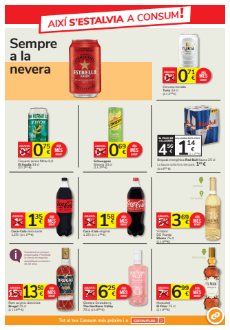 135 1 %u20ac 49%u20acABANS:Coca-Cola zero sucre1,25 l (1 l: 108 %u20ac)ARAM%u00c9SBARAT 158 1 %u20ac 72%u20acABANS:Coca-Cola original 1,25 l (1 l: 126 %u20ac)ARAM%u00c9SBARAT075 0 %u20ac 85%u20acABANS:Cervesa sense filtrar 0,0 El %u00c1guila 33 cl (1 l: 227 %u20ac)ARAM%u00c9SBARAT071 0 %u20ac 84%u20acABANS:Cervesa torrada Turia 33 cl(1 l: 215 %u20ac)ARAM%u00c9SBARAT069 0 %u20ac 97%u20acABANS:Schweppesllimona 33 cl(1 l: 209 %u20ac)ARAM%u00c9SBARATBeguda energ%u00e8tica Red Bull llauna 25 clLa llauna solta fora del pack: 163 %u20ac(1 l: 652 %u20ac)EL PACK DE4 LLAUNESLA LLAUNA EN EL PACK1(1 l: 456 %u20ac)14 4 %u20ac 56%u20acMOSCATELL625 7 %u20ac 15%u20acABANS:Ginebra StrawberryThe Northern Valley 70 cl (1 l: 893 %u20ac)ARAM%u00c9S 13 BARAT50 15 %u20ac 95%u20acABANS:Rom anyenc dominic%u00e0Brugal 70 cl(1 l: 1929 %u20ac)ARAM%u00c9SBARAT 699 7 %u20ac 95%u20acABANS:MoscatellEl Prior 75 cl(1 l: 932 %u20ac)ARAM%u00c9SBARATVERDEJODO RUEDA369 5 %u20ac 65%u20acABANS:Vi blancDO RuedaBlume 75 cl (1 l: 492 %u20ac)ARAM%u00c9SBARATGaudeix d%u2019un consum responsable. Prohibida la venda de begudes alcoh%u00f2liques a menors de 18 anys.AIX%u00cd S%u2019ESTALVIA A CONSUM!Sempre a la neveraTot al teu Consum m%u00e9s pr%u00f2xim i a consum.es