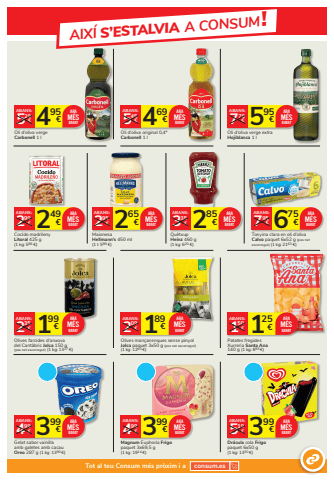 AIX%u00cd S%u2019ESTALVIA A CONSUM!189 2 %u20ac 09%u20acABANS:Olives man%u00e7anenques sense pinyol Jolca paquet 3x50 g (pes net escorregut)(1 kg: 1260 %u20ac)ARAM%u00c9SBARAT399 5 %u20ac 19%u20acABANS:Dr%u00e1cula cola Frigopaquet 6x50 g (1 kg: 1330 %u20ac)ARAM%u00c9S 3 BARAT99 4 %u20ac 99%u20acABANS:Magnum Euphoria Frigo paquet 3x69,5 g (1 kg: 1914 %u20ac)ARAM%u00c9SBARAT125 1 %u20ac 50%u20acABANS:Patates fregidesXurreria Santa Ana140 g (1 kg: 893 %u20ac)ARAM%u00c9SBARAT399 4 %u20ac 99%u20acABANS:Gelat sabor vainilla amb galetes amb cacauOreo 287 g (1 kg: 1390 %u20ac)ARAM%u00c9SBARAT675 7 %u20ac 95%u20acABANS:Tonyina clara en oli d%u2019olivaCalvo paquet 6x52 g (pes net escorregut) (1 kg: 2163 %u20ac)ARAM%u00c9S 2 BARAT85 3 %u20ac 35%u20acABANS:Qu%u00e8txup Heinz 460 g (1 kg: 620 %u20ac)ARAM%u00c9S 2 BARAT65 2 %u20ac 95%u20acABANS:Maionesa Hellmann%u2019s 450 ml(1 l: 589 %u20ac)ARAM%u00c9SBARAT469 5 %u20ac 45%u20acABANS:Oli d%u2019oliva original 0,4%u00ba Carbonell 1 lARAM%u00c9S 4 BARAT95 5 %u20ac 29%u20acABANS:Oli d%u2019oliva vergeCarbonell 1 lARAM%u00c9SBARAT 595 7 %u20ac 79%u20acABANS:Oli d%u2019oliva verge extraHojiblanca 1 lARAM%u00c9SBARAT249 2 %u20ac 99%u20acABANS:Cocido madrileny Litoral 425 g (1 kg: 586 %u20ac)ARAM%u00c9SBARAT199 2 %u20ac 35%u20acABANS:Olives farcides d%u2019anxovadel Cant%u00e0bric Jolca 150 g(pes net escorregut) (1 kg: 1327 %u20ac)ARAM%u00c9SBARATTot al teu Consum m%u00e9s pr%u00f2xim i a consum.es