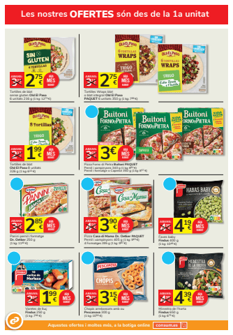 Les nostres OFERTES s%u00f3n des de la 1a unitat419 4 %u20ac 99%u20acABANS:Faves baby Findus 400 g (1 kg: 1048 %u20ac)ARAM%u00c9SBARAT439 4 %u20ac 99%u20acABANS:Minestra de l%u2019hortaFindus 650 g (1 kg: 675 %u20ac)ARAM%u00c9S 1 BARAT99 2 %u20ac 99%u20acABANS:Varetes de llu%u00e7Findus 250 g(1 kg: 796 %u20ac)ARAM%u00c9SBARAT 315 3 %u20ac 79%u20acABANS:Chopis arrebossats amb ouPescanova 300 g(1 kg: 1050 %u20ac)ARAM%u00c9SBARAT285 3 %u20ac 35%u20acABANS:Panini pernil i formatgeDr. Oetker 250 g (1 kg: 1140 %u20ac)ARAM%u00c9SBARAT 390 4 %u20ac 59%u20acABANS:Pizza Casa di Mama Dr. Oetker PAQUETPernil i xampinyons 405 g (1 kg: 963 %u20ac)4 Formatges 395 g (1 kg: 987 %u20ac)ARAM%u00c9SBARAT3%u20ac 365%u20acABANS:Pizza Forno di Pietra Buitoni PAQUETPernil i xampinyons 340 g (1 kg: 882 %u20ac) Pernil i formatge o Caprese 350 g (1 kg: 857 %u20ac)ARAM%u00c9SBARAT275 3 %u20ac 21%u20acABANS:Tortilles Wraps blat o blat integral Old El Paso PAQUET 6 unitats 350 g (1 kg: 786 %u20ac)ARAM%u00c9S 2 BARAT75 3 %u20ac 21%u20acABANS:Tortilles de blat sense gluten Old El Paso 6 unitats 216 g (1 kg: 1273 %u20ac)ARAM%u00c9SBARAT199 2 %u20ac 32%u20acABANS:Tortilles de blat Old El Paso 8 unitats 326 g (1 kg: 610 %u20ac)ARAM%u00c9SBARATAquestes ofertes i moltes m%u00e9s, a la botiga online consum.es