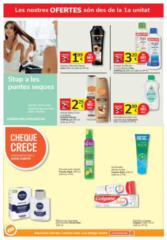 B%u00e0lsam de massatgepell sensible Nivea Men100 mlDentifrici original Colgate Total 75 ml(100 ml: 387 %u20ac)299 3 %u20ac 75%u20acABANS:Oli hidratant %u00e0loe vera pell delicada Johnson%u2019s500 ml (100 ml: 060 %u20ac)ARAM%u00c9SBARATLes nostres OFERTES s%u00f3n des de la 1a unitat199 3 %u20ac 05%u20acABANS:Xamp%u00fa Ultimate Repair Gliss 250 ml (100 ml: 080 %u20ac)ARAM%u00c9SBARAT225 2 %u20ac 69%u20acABANS:Gel de dutxa Coco o Arg%u00e0niaNatural HoneyAMPOLLA 650 ml(100 ml: 035 %u20ac)ARAM%u00c9SBARATcuidarnos.consum.esStop a les puntes sequesApr%u00e8n com pots reparar les puntes dels cabells.320 3 %u20ac 75%u20acABANS:Xamp%u00fa fortificanto cura cl%u00e0ssica FlexAMPOLLA 650 ml (100 ml: 049 %u20ac)ARAM%u00c9SBARATCHEQUE CRECEDESCOMPTE PER A SOCIS CLIENTSGel fixador efecte mullat Fructis Style 250 ml(100 ml: 110 %u20ac)Escuma nutri r%u00ednxols Fructis Style 300 ml(100 ml: 116 %u20ac)Aquestes ofertes i moltes m%u00e9s, a la botiga online consum.es