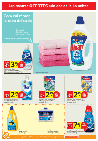 Descobreixels millors trucsper a rentar la roba.consum.es/drogueria/consejosCom cal rentar la roba delicadaNetejam%u00e0quinesrentaplats Finish250 ml (1 l: 1580 %u20ac)249 3%u20ac %u20acABANS:Penjador WC Power Activ pi Bref paquet 2 unitats(la unitat: 125 %u20ac)ARAM%u00c9SBARAT 249 3 %u20ac 35%u20acABANS:Penjador WC Power Activ llimona Bref paquet 2 unitats (la unitat: 125 %u20ac)ARAM%u00c9SBARAT315 4 %u20ac 15%u20acABANS:Perfumador l%u00edquid per a la roba blau Asevi36 rentades (la rentada: 009 %u20ac)ARAM%u00c9SBARAT249 3 %u20ac 99%u20acABANS:Suavitzant concentratBlau Flor 59 rentades (la rentada: 004 %u20ac)ARAM%u00c9SBARATSuggeriment de presentaci%u00f3Les nostres OFERTES s%u00f3n des de la 1a unitatCera terres incolora Alex 750 ml (1 l: 532 %u20ac)Aquestes ofertes i moltes m%u00e9s, a la botiga online consum.es740 11 %u20ac 50%u20acABANS:Rentaplats m%u00e0quina gelTot en 1 Finish 50 rentades(la rentada: 015 %u20ac)ARAM%u00c9SBARAT