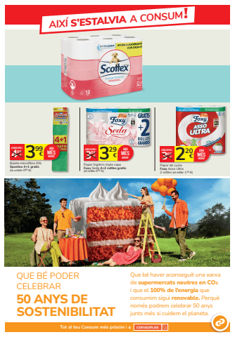 399 4 %u20ac 99%u20acABANS:Baieta microfibra XXLSpontex 4+1 gratis(la unitat: 080 %u20ac)ARAM%u00c9SBARAT 220 3 %u20ac 69%u20acABANS:Paper de cuina Foxy Asso Ultra 2 rotlles (el rotlle: 110 %u20ac)ARAM%u00c9S 3 BARAT29 3 %u20ac 89%u20acABANS:Paper higi%u00e8nic triple capa Foxy Seda 4+2 rotlles gratis(el rotlle: 055 %u20ac)ARAM%u00c9SBARATAIX%u00cd S%u2019ESTALVIA A CONSUM!50 ANYS DE SOSTENIBILITAT QUE B%u00c9 PODER CELEBRARQue b%u00e9 haver aconseguit una xarxa de supermercats neutres en CO%u2082i que el 100% de l%u2019energia que consumim sigui renovable. Perqu%u00e8 nom%u00e9s podrem celebrar 50 anys junts m%u00e9s si cuidem el planeta.Tot al teu Consum m%u00e9s pr%u00f2xim i a consum.es