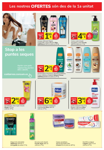 Stop a les puntes sequesApr%u00e8n com pots reparar les puntes dels cabells.cuidarnos.consum.es639 7 %u20ac 99%u20acABANS:Crema hidratant antitaques niacinamida Mixa 400 ml(100 ml: 160 %u20ac)ARAM%u00c9SBARAT 399 4 %u20ac 99%u20acABANS:Loci%u00f3 corporal Urea Cica Repair+ pell seca Mixa250 ml (100 ml: 160 %u20ac)ARAM%u00c9SBARATEscuma nutri r%u00ednxols Fructis Style 300 ml (100 ml: 116 %u20ac)Dentifrici original Colgate Total 75 ml(100 ml: 387 %u20ac)Maquineta rebutjableWilkinson Xtreme 3 4+4 gratis (la unitat: 074 %u20ac)199 3 %u20ac 05%u20acABANS:Xamp%u00fa Ultimate Repair, Liquid Silk o Aqua Revive GlissAMPOLLA 250 ml (100 ml: 080 %u20ac)ARAM%u00c9SBARAT225 2 %u20ac 69%u20acABANS:Gel de dutxa Amazonia, Micel%u00b7lar purificant, Coco, Col%u00f2nia o Arg%u00e0nia Natural Honey AMPOLLA 650 ml (100 ml: 035 %u20ac)ARAM%u00c9SBARAT469 5 %u20ac 89%u20acABANS:Crema nutri r%u00ednxols eixugada a l%u2019aire Fructis400 ml (100 ml: 117 %u20ac)ARAM%u00c9SBARATCrema omplidora SPF50 Revitalift Filler L%u2019Or%u00e9al 50 ml (100 ml: 3980 %u20ac)280 3 %u20ac 30%u20acABANS:Gel defineix i fixa super r%u00ednxols Giorgi 170 ml (100 ml: 165 %u20ac)ARAM%u00c9SBARATLes nostres OFERTES s%u00f3n des de la 1a unitat