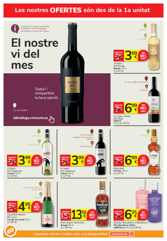 ULL DE LLEBRElabodega.consum.esTasta%u2019l i comparteix la teva opini%u00f3.El nostre vi del mesULL DE LLEBRE / GARNATXADO RIOJAVERDEJODO RUEDAMOSCATEL699 7 %u20ac 95%u20acABANS:Vi negre crian%u00e7aDO Rioja Ederra75 cl (1 l: 932 %u20ac)ARAM%u00c9SBARAT625 7 %u20ac 15%u20acABANS:Ginebra Strawberry o Blackberry The Northern Valley AMPOLLA 70 cl (1 l: 893 %u20ac)ARAM%u00c9S 13 BARAT50 15 %u20ac 95%u20acABANS:Rom anyenc dominic%u00e0Brugal 70 cl(1 l: 1929 %u20ac)ARAM%u00c9SBARAT369 5 %u20ac 65%u20acABANS:Vi blancDO RuedaBlume 75 cl (1 l: 492 %u20ac)ARAM%u00c9SBARATULL DE LLEBRE/CABERNET SAUVIGNON /MERLOTDO CATALUNYAXAREL%u00b7LODO CATALUNYA399 5 %u20ac 29%u20acABANS:Vi blanc DO CatalunyaCabr%u00f3! 75 cl(1 l: 532 %u20ac)ARAM%u00c9SBARAT495 5 %u20ac 95%u20acABANS:Cava Brut Nature DO Cava Conde de Caralt 75 cl(1 l: 660 %u20ac)ARAM%u00c9SBARAT399 5 %u20ac 29%u20acABANS:Vi negreDO CatalunyaCabr%u00f3! 75 cl(1 l: 532 %u20ac)ARAM%u00c9SBARAT 699 7 %u20ac 95%u20acABANS:MoscatellEl Prior 75 cl(1 l: 932 %u20ac)ARAM%u00c9SBARATMACABEU / XAREL%u00b7LO / PARELLADADO CAVALes nostres OFERTES s%u00f3n des de la 1a unitatAquestes ofertes i moltes m%u00e9s, a la botiga online consum.esGaudeix d%u2019un consum responsable. Prohibida la venda de begudes alcoh%u00f2liques a menors de 18 anys.
