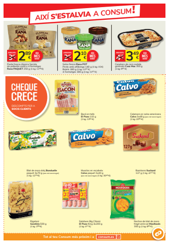 Rigatoni Garofalo 500 g(1 kg: 358 %u20ac)Blat de moro dol%u00e7 Bonduellepaquet 3x70 g (pes net escorregut) (1 kg: 1233 %u20ac)Salsitxes Big Cl%u00e0ssic El Pozo King 3x200 g(1 kg: 417 %u20ac)Musclos en escabetxCalvo paquet 3x40 g(pes net escorregut) (1 kg: 3042 %u20ac)Bac%u00f3 en talls El Pozo 110 g(1 kg: 1364 %u20ac)Nachos de blat de moro fregit amb sal Mexifoods300 g (1 kg: 883 %u20ac)Bombons Suchard127 g (1 kg: 4717 %u20ac) Calamars en salsa americana Calvo 3x48 g (pes net escorregut)(1 kg: 2396 %u20ac)210 2 %u20ac 40%u20acABANS:Salsa fresca Rana POTPesto amb alf%u00e0brega 140 g (1 kg: 15 %u20ac)Bolets 180 g (1 kg: 1167 %u20ac) 4 Formatges 180 g (1 kg: 1167 %u20ac)ARAM%u00c9S 2 BARAT89 3 %u20ac 45%u20acABANS:Pasta fresca cl%u00e0ssica farcida de pollastre rostit o 4 formatges Rana PAQUET 250 g (1 kg: 1156 %u20ac)ARAM%u00c9SBARAT 349 4 %u20ac 19%u20acABANS:Canelons de carn rostidagratinats Casa Mas 350 g(1 kg: 997 %u20ac)ARAM%u00c9SBARATAIX%u00cd S%u2019ESTALVIA A CONSUM!Tot al teu Consum m%u00e9s pr%u00f2xim i a consum.esCHEQUE CRECEDESCOMPTE PER A SOCIS CLIENTS