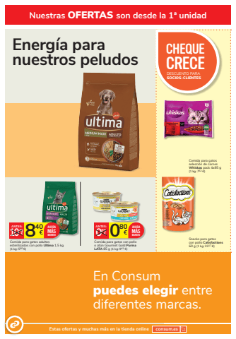 En Consum puedes elegir entre diferentes marcas.Nuestras OFERTAS son desde la 1%u00aa unidadEstas ofertas y muchas m%u00e1s en la tienda online consum.esSnacks para gatos con pollo Catisfactions60 g (1 kg: 3317 %u20ac)Comida para gatos selecci%u00f3n de carnes Whiskas pack 4x85 g (1 kg: 762 %u20ac)DESCUENTO PARASOCIOS-CLIENTESCHEQUE CRECE080 0 %u20ac 89%u20acANTES:Comida para gatos con pollo o at%u00fan Gourmet Gold Purina LATA 85 g (1 kg: 941 %u20ac)AHORAM%u00c1S 8 BARATO40 10 %u20ac 49%u20acANTES:Comida para gatos adultos esterilizados con pollo Ultima 1,5 kg (1 kg: 560 %u20ac)AHORAM%u00c1SBARATOEnerg%u00eda para nuestros peludos