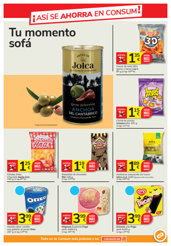 %u00a1AS%u00cd SE AHORRA EN CONSUM!Todo en tu Consum m%u00e1s pr%u00f3ximo y en consum.es135 1 %u20ac 50%u20acANTES:Conos de ma%u00edz 3D%u2019s queso y bacon Lay%u2019s85 g (1 kg: 1588 %u20ac)AHORAM%u00c1SBARATO189 2 %u20ac 09%u20acANTES:Aceitunas manzanilla sin hueso Jolca pack 3x50 g (peso neto escurrido)(1 kg: 1260 %u20ac)AHORAM%u00c1SBARATO399 5 %u20ac 19%u20acANTES:Dr%u00e1cula cola Frigopack 6x50 g (1 kg: 1330 %u20ac)AHORAM%u00c1S 3 BARATO99 4 %u20ac 99%u20acANTES:Magnum Euphoria Frigo pack 3x69,5 g (1 kg: 1914 %u20ac)AHORAM%u00c1SBARATO125 1 %u20ac 50%u20acANTES:Patatas fritas Churrer%u00eda Santa Ana140 g (1 kg: 893 %u20ac)AHORAM%u00c1SBARATO 119 1 %u20ac 40%u20acANTES:Palomitas de chocolate Risi 100 g(1 kg: 1190 %u20ac)AHORAM%u00c1SBARATO115 1 %u20ac 40%u20acANTES:C%u00f3ctel de snacks Jumpers Mix 100 g(1 kg: 1150 %u20ac)AHORAM%u00c1SBARATO399 4 %u20ac 99%u20acANTES:Helado sabor vainilla con galletas al cacao Oreo 287 g (1 kg: 1390 %u20ac)AHORAM%u00c1SBARATOSugerencia de presentaci%u00f3nTu momento sof%u00e1