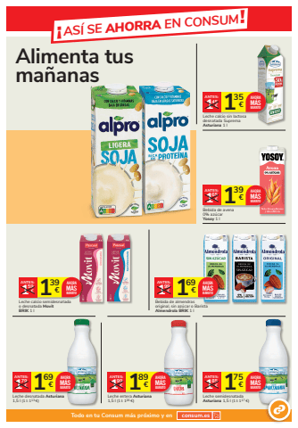%u00a1AS%u00cd SE AHORRA EN CONSUM!139 1 %u20ac 65%u20acANTES:Bebida de avena 0% az%u00facar Yosoy 1 lAHORAM%u00c1SBARATO135 1 %u20ac 45%u20acANTES:Leche calcio sin lactosadesnatada SupremaAsturiana 1 lAHORAM%u00c1SBARATOTodo en tu Consum m%u00e1s pr%u00f3ximo y en consum.es139 1 %u20ac 59%u20acANTES:Leche calcio semidesnatada o desnatada MovitBRIK 1 lAHORAM%u00c1SBARATO189 1 %u20ac 99%u20acANTES:Leche entera Asturiana 1,5 l (1 l: 126 %u20ac)AHORAM%u00c1S 1 BARATO69 1 %u20ac 79%u20acANTES:Leche desnatada Asturiana 1,5 l (1 l: 113 %u20ac)AHORAM%u00c1SBARATO 175 1 %u20ac 85%u20acANTES:Leche semidesnatada Asturiana 1,5 l (1 l: 117 %u20ac)AHORAM%u00c1SBARATO169 1 %u20ac 99%u20acANTES:Bebida de almendras original, sin az%u00facar o BaristaAlmendrola BRIK 1 lAHORAM%u00c1SBARATOAlimenta tus ma%u00f1anas