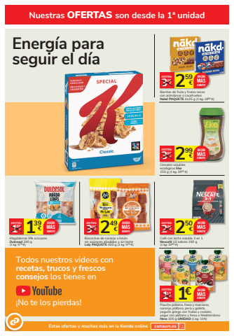 Todos nuestros videos con recetas, trucos y frescos consejos los tienes en %u00a1No te los pierdas!Nuestras OFERTAS son desde la 1%u00aa unidadEstas ofertas y muchas m%u00e1s en la tienda online consum.es250 2 %u20ac 95%u20acANTES:Caf%u00e9 con leche soluble 3 en 1 Nescaf%u00e9 10 sobres 160 g(1 kg: 1563 %u20ac)AHORAM%u00c1SBARATO299 3 %u20ac 60%u20acANTES:Cereales solublesecol%u00f3gicos Eko150 g (1 kg: 1993 %u20ac)AHORAM%u00c1SBARATO259 3 %u20ac 09%u20acANTES:Barritas de fruta y frutos secoscon ar%u00e1ndanos o cacahuetesNakd PAQUETE 4x35 g (1 kg: 1850 %u20ac)AHORAM%u00c1SBARATO249 3 %u20ac 09%u20acANTES:Bizcochos de naranja o lim%u00f3n sin az%u00facares a%u00f1adidos y sin leche Laly PAQUETE 450 g (1 kg: 553 %u20ac)AHORAM%u00c1S 1 BARATO39 1 %u20ac 65%u20acANTES:Magdalenas 0% az%u00facares Dulcesol 240 g (1 kg: 579 %u20ac) AHORAM%u00c1SBARATO1%u20ac 119%u20acANTES:Pouche pl%u00e1tano, fresa y manzana,naranja, pl%u00e1tano, pera y galleta,yogur%u00edn griego con frutas y cookies, yogur con pl%u00e1tano y fresa o Mediterr%u00e1neo Hero 100 g UNIDAD (1 kg: 10 %u20ac)AHORAM%u00c1SBARATOEnerg%u00eda para seguir el d%u00eda