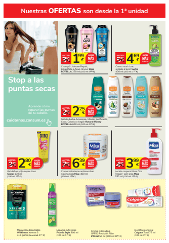 Nuestras OFERTAS son desde la 1%u00aa unidadStop a las puntas secasAprende c%u00f3mo reparar las puntas de tu cabello.cuidarnos.consum.es639 7 %u20ac 99%u20acANTES:Crema hidratante antimanchas niacinamida Mixa 400 ml(100 ml: 160 %u20ac)AHORAM%u00c1SBARATO 399 4 %u20ac 99%u20acANTES:Loci%u00f3n corporal Urea Cica Repair+ piel seca Mixa250 ml (100 ml: 160 %u20ac)AHORAM%u00c1SBARATOEspuma nutri rizos Fructis Style 300 ml (100 ml: 116 %u20ac)Dent%u00edfrico original Colgate Total 75 ml(100 ml: 387 %u20ac)Maquinilla desechableWilkinson Xtreme 3 4+4 gratis (la unidad: 074 %u20ac)199 3 %u20ac 05%u20acANTES:Champ%u00fa Ultimate Repair, Liquid Silk o Aqua Revive GlissBOTELLA 250 ml (100 ml: 080 %u20ac)AHORAM%u00c1SBARATO225 2 %u20ac 69%u20acANTES:Gel de ducha Amazonia, Micelar purificante, Coco, Colonia o Arg%u00e1n Natural Honey BOTELLA 650 ml (100 ml: 035 %u20ac)AHORAM%u00c1SBARATO469 5 %u20ac 89%u20acANTES:Crema nutri rizos secado al aire Fructis400 ml (100 ml: 117 %u20ac)AHORAM%u00c1SBARATOCrema rellenadora SPF50 Revitalift Filler L%u2019Or%u00e9al 50 ml (100 ml: 3980 %u20ac)280 3 %u20ac 30%u20acANTES:Gel define y fija super rizos Giorgi 170 ml (100 ml: 165 %u20ac)AHORAM%u00c1SBARATO