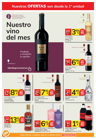 TEMPRANILLOlabodega.consum.esPru%u00e9balo y comparte tu opini%u00f3n.Nuestras OFERTAS son desde la 1%u00aa unidadEstas ofertas y muchas m%u00e1s en la tienda online consum.esNuestro vino del mesDisfruta de un consumo responsable. Prohibida la venta de bebidas alcoh%u00f3licas a menores de 18 a%u00f1os.TEMPRANILLOD. O. RIBERA DEL DUEROTEMPRANILLO D. O. CIGALESTEMPRANILLO / GARNACHAD. O. RIOJAVERDEJOD. O. RUEDA699 7 %u20ac 95%u20acANTES:Vino tinto crianza D. O. RiojaEderra75 cl (1 l: 932 %u20ac)AHORAM%u00c1SBARATO739 8 %u20ac 75%u20acANTES:Vino tinto robleD. O. Ribera del DueroPortia75 cl (1 l: 985 %u20ac)AHORAM%u00c1SBARATO625 7 %u20ac 15%u20acANTES:Ginebra Strawberry o Blackberry The Northern Valley BOTELLA 70 cl (1 l: 893 %u20ac)AHORAM%u00c1SBARATO 135 1 %u20ac 49%u20acANTES:Coca-Cola original o zero az%u00facarBOTELLA 1,25 l (1 l: 108 %u20ac)AHORAM%u00c1SBARATO1350 15 %u20ac 95%u20acANTES:Ron a%u00f1ejo Brugal 70 cl(1 l: 1929 %u20ac)AHORAM%u00c1SBARATO369 5 %u20ac 65%u20acANTES:Vino blancoD. O. RuedaBlume 75 cl(1 l: 492 %u20ac)AHORAM%u00c1SBARATO899 12 %u20ac 20%u20acANTES:Vino tinto crianzaD. O. CigalesValdelosfrailes75 cl (1 l: 1199 %u20ac)AHORAM%u00c1SBARATO 449 4 %u20ac 99%u20acANTES:Moscatel espumosoMarina75 cl (1 l: 599 %u20ac)AHORAM%u00c1SBARATOMOSCATEL DE ALEJANDRIA