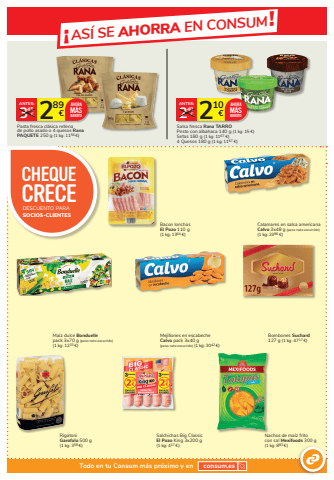 %u00a1AS%u00cd SE AHORRA EN CONSUM!Todo en tu Consum m%u00e1s pr%u00f3ximo y en consum.esRigatoni Garofalo 500 g(1 kg: 358 %u20ac)Ma%u00edz dulce Bonduellepack 3x70 g (peso neto escurrido) (1 kg: 1233 %u20ac)Salchichas Big Classic El Pozo King 3x200 g(1 kg: 417 %u20ac)Mejillones en escabeche Calvo pack 3x40 g(peso neto escurrido) (1 kg: 3042 %u20ac)Bacon lonchas El Pozo 110 g(1 kg: 1364 %u20ac)Nachos de ma%u00edz fritocon sal Mexifoods 300 g (1 kg: 883 %u20ac)Bombones Suchard127 g (1 kg: 4717 %u20ac) Calamares en salsa americana Calvo 3x48 g (peso neto escurrido)(1 kg: 2396 %u20ac)DESCUENTO PARASOCIOS-CLIENTESCHEQUE CRECE210 2 %u20ac 40%u20acANTES:Salsa fresca Rana TARROPesto con albahaca 140 g (1 kg: 15 %u20ac)Setas 180 g (1 kg: 1167 %u20ac) 4 Quesos 180 g (1 kg: 1167 %u20ac)AHORAM%u00c1S 2 BARATO89 3 %u20ac 45%u20acANTES:Pasta fresca cl%u00e1sica rellena de pollo asado o 4 quesos Rana PAQUETE 250 g (1 kg: 1156 %u20ac)AHORAM%u00c1SBARATO