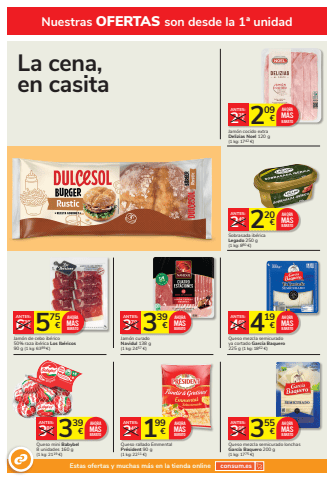 Nuestras OFERTAS son desde la 1%u00aa unidadEstas ofertas y muchas m%u00e1s en la tienda online consum.es575 6 %u20ac 39%u20acANTES:Jam%u00f3n de cebo ib%u00e9rico 50% raza ib%u00e9rica Los Ib%u00e9ricos90 g (1 kg: 6389 %u20ac)AHORAM%u00c1SBARATO220 2 %u20ac 49%u20acANTES:Sobrasada ib%u00e9rica Legado 250 g(1 kg: 880 %u20ac)AHORAM%u00c1SBARATO209 2 %u20ac 35%u20acANTES:Jam%u00f3n cocido extra Delizias Noel 120 g(1 kg: 1742 %u20ac)AHORAM%u00c1SBARATO339 3 %u20ac 79%u20acANTES:Jam%u00f3n curado Navidul 138 g(1 kg: 2457 %u20ac)AHORAM%u00c1SBARATO199 2 %u20ac 49%u20acANTES:Queso rallado Emmental Pr%u00e9sident 90 g(1 kg: 2211 %u20ac)AHORAM%u00c1S 3 BARATO39 3 %u20ac 80%u20acANTES:Queso mini Babybel8 unidades 160 g (1 kg: 2119 %u20ac)AHORAM%u00c1SBARATOLa cena, en casita 419 4 %u20ac 69%u20acANTES:Queso mezcla semicurado ya cortado Garc%u00eda Baquero225 g (1 kg: 1862 %u20ac)AHORAM%u00c1SBARATO355 3 %u20ac 95%u20acANTES:Queso mezcla semicurado lonchas Garc%u00eda Baquero 200 g(1 kg: 1775 %u20ac)AHORAM%u00c1SBARATO