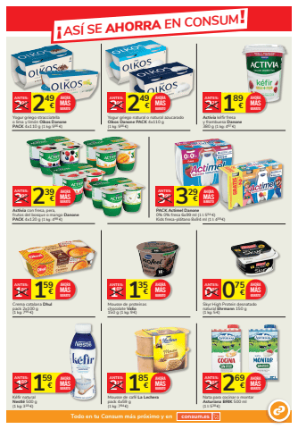 %u00a1AS%u00cd SE AHORRA EN CONSUM!Todo en tu Consum m%u00e1s pr%u00f3ximo y en consum.es159 1 %u20ac 89%u20acANTES:Crema catalana Dhulpack 2x100 g (1 kg: 795 %u20ac)AHORAM%u00c1SBARATO 135 1 %u20ac 69%u20acANTES:Mousse de prote%u00ednas chocolate Valio150 g (1 kg: 9 %u20ac)AHORAM%u00c1SBARATO329 3 %u20ac 99%u20acANTES:PACK Actimel Danone0% 0% fresa 6x99 ml (1 l: 554 %u20ac)Kids fresa-pl%u00e1tano 8x94 ml (1 l: 438 %u20ac)AHORAM%u00c1SBARATO159 1 %u20ac 89%u20acANTES:K%u00e9fir natural Nestl%u00e9 500 g(1 kg: 318 %u20ac)AHORAM%u00c1SBARATO 185 2 %u20ac 15%u20acANTES:Mousse de caf%u00e9 La Lechera pack 4x59 g(1 kg: 784 %u20ac)AHORAM%u00c1SBARATO 269 2 %u20ac 85%u20acANTES:Nata para cocinar o montar Asturiana BRIK 500 ml(1 l: 538 %u20ac)AHORAM%u00c1SBARATO249 2 %u20ac 99%u20acANTES:Yogur griego stracciatella o lima y lim%u00f3n Oikos DanonePACK 4x110 g (1 kg: 566 %u20ac)AHORAM%u00c1SBARATO 249 2 %u20ac 99%u20acANTES:Yogur griego natural o natural azucaradoOikos Danone PACK 4x110 g (1 kg: 566 %u20ac)AHORAM%u00c1SBARATO 189 2 %u20ac 25%u20acANTES:Activia k%u00e9fir fresa y frambuesa Danone 380 g (1 kg: 497 %u20ac)AHORAM%u00c1SBARATO239 2 %u20ac 99%u20acANTES:Activia con fresa, pera, frutos del bosque o mango Danone PACK 4x120 g (1 kg: 498 %u20ac)AHORAM%u00c1SBARATO075 0 %u20ac 89%u20acANTES:Skyr High Protein desnatado natural Ehrmann 150 g(1 kg: 5 %u20ac)AHORAM%u00c1SBARATO