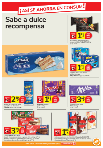 %u00a1AS%u00cd SE AHORRA EN CONSUM!Todo en tu Consum m%u00e1s pr%u00f3ximo y en consum.es249 2 %u20ac 79%u20acANTES:Bollito de cacao con leche y pepitas de chocolateWeikis 240 g (1 kg: 1038 %u20ac)AHORAM%u00c1SBARATO 165 1 %u20ac 94%u20acANTES:Huesitos Combix pack 5x20 g (1 kg: 1650 %u20ac)AHORAM%u00c1SBARATO 319 3 %u20ac 79%u20acANTES:Chocolate con leche Milka 250 g(1 kg: 1276 %u20ac)AHORAM%u00c1SBARATO165 1 %u20ac 99%u20acANTES:Galletas Mini Chips Ahoy! o Mini Oreo Lu PAQUETE 160 g (1 kg: 1031 %u20ac)AHORAM%u00c1SBARATO379 4 %u20ac 49%u20acANTES:Turr%u00f3n Nestl%u00e9 PASTILLAJungly chocolate con leche y galleta 232 g (1 kg: 1634 %u20ac)Relleno cremoso y galleta Filipinos 232 g (1 kg: 1634 %u20ac)Cereales crujientes Crunch 190 g (1 kg: 1995 %u20ac)AHORAM%u00c1SBARATO 189 2 %u20ac 25%u20acANTES:Galletas cubiertas de chocolate Mikado Lu PAQUETEChocolate con leche o chocolate negro 75 g (1 kg: 2520 %u20ac) Chocolate blanco 70 g (1 kg: 27 %u20ac)AHORAM%u00c1SBARATO115 1 %u20ac 35%u20acANTES:Bizcochitos rellenos de fresa o naranja Mels PAQUETE 150 g (1 kg: 767 %u20ac)AHORAM%u00c1SBARATOSabe a dulce recompensa