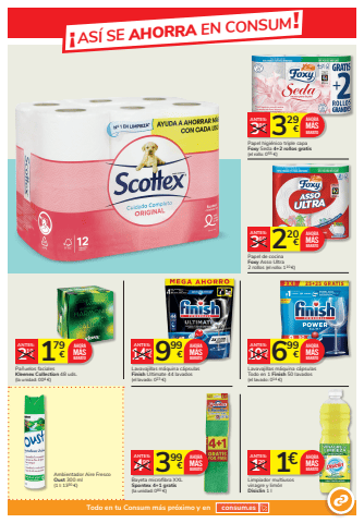 %u00a1AS%u00cd SE AHORRA EN CONSUM!Todo en tu Consum m%u00e1s pr%u00f3ximo y en consum.es179 2 %u20ac 19%u20acANTES:Pa%u00f1uelos faciales Kleenex Collection 48 uds.(la unidad: 004 %u20ac)AHORAM%u00c1SBARATO220 3 %u20ac 69%u20acANTES:Papel de cocina Foxy Asso Ultra 2 rollos (el rollo: 110 %u20ac)AHORAM%u00c1SBARATO1%u20ac 129%u20acANTES:Limpiador multiusosvinagre y lim%u00f3nDisiclin 1 lAHORAM%u00c1SBARATO329 3 %u20ac 89%u20acANTES:Papel higi%u00e9nico triple capa Foxy Seda 4+2 rollos gratis(el rollo: 055 %u20ac)AHORAM%u00c1SBARATOAmbientador Aire Fresco Oust 300 ml(1 l: 1330 %u20ac)999 14 %u20ac 99%u20acANTES:Lavavajillas m%u00e1quina c%u00e1psulasFinish Ultimate 44 lavados (el lavado: 023 %u20ac)AHORAM%u00c1SBARATO 699 10 %u20ac 99%u20acANTES:Lavavajillas m%u00e1quina c%u00e1psulasTodo en 1 Finish 50 lavados (el lavado: 014 %u20ac)AHORAM%u00c1SBARATO399 4 %u20ac 99%u20acANTES:Bayeta microfibra XXLSpontex 4+1 gratis(la unidad: 080 %u20ac)AHORAM%u00c1SBARATO