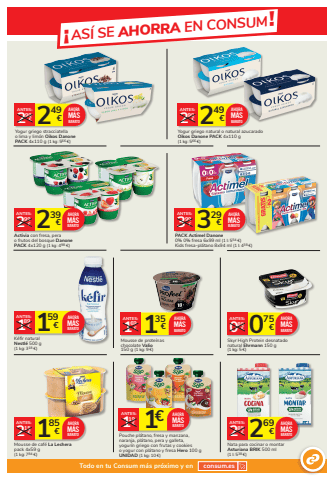 1%u20ac 119%u20acANTES:Pouche pl%u00e1tano, fresa y manzana,naranja, pl%u00e1tano, pera y galleta,yogur%u00edn griego con frutas y cookies o yogur con pl%u00e1tano y fresa Hero 100 gUNIDAD (1 kg: 10 %u20ac)AHORAM%u00c1SBARATO%u00a1AS%u00cd SE AHORRA EN CONSUM!Todo en tu Consum m%u00e1s pr%u00f3ximo y en consum.es135 1 %u20ac 69%u20acANTES:Mousse de prote%u00ednas chocolate Valio150 g (1 kg: 9 %u20ac)AHORAM%u00c1SBARATO329 3 %u20ac 99%u20acANTES:PACK Actimel Danone0% 0% fresa 6x99 ml (1 l: 554 %u20ac)Kids fresa-pl%u00e1tano 8x94 ml (1 l: 438 %u20ac)AHORAM%u00c1SBARATO159 1 %u20ac 89%u20acANTES:K%u00e9fir natural Nestl%u00e9 500 g(1 kg: 318 %u20ac)AHORAM%u00c1SBARATO185 2 %u20ac 15%u20acANTES:Mousse de caf%u00e9 La Lechera pack 4x59 g(1 kg: 784 %u20ac)AHORAM%u00c1SBARATO 269 2 %u20ac 85%u20acANTES:Nata para cocinar o montar Asturiana BRIK 500 ml(1 l: 538 %u20ac)AHORAM%u00c1SBARATO249 2 %u20ac 99%u20acANTES:Yogur griego stracciatella o lima y lim%u00f3n Oikos DanonePACK 4x110 g (1 kg: 566 %u20ac)AHORAM%u00c1SBARATO 249 2 %u20ac 99%u20acANTES:Yogur griego natural o natural azucaradoOikos Danone PACK 4x110 g (1 kg: 566 %u20ac)AHORAM%u00c1SBARATO075 0 %u20ac 89%u20acANTES:Skyr High Protein desnatado natural Ehrmann 150 g(1 kg: 5 %u20ac)AHORAM%u00c1SBARATO239 2 %u20ac 99%u20acANTES:Activia con fresa, pera o frutos del bosque DanonePACK 4x120 g (1 kg: 498 %u20ac)AHORAM%u00c1SBARATO