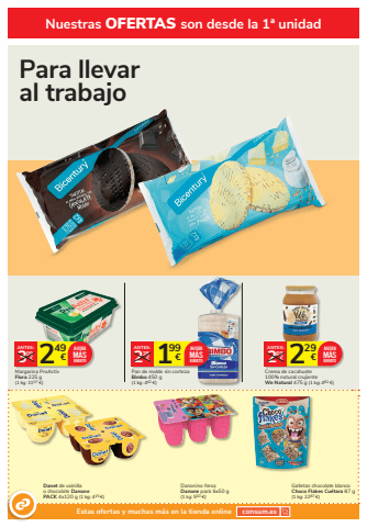 Nuestras OFERTAS son desde la 1%u00aa unidadEstas ofertas y muchas m%u00e1s en la tienda online consum.es229 2 %u20ac 69%u20acANTES:Crema de cacahuete 100% natural crujiente We Natural 475 g (1 kg: 482 %u20ac)AHORAM%u00c1S 1 BARATO99 2 %u20ac 35%u20acANTES:Pan de molde sin corteza Bimbo 450 g(1 kg: 442 %u20ac)AHORAM%u00c1SBARATODanet de vainilla o chocolate DanonePACK 4x120 g (1 kg: 415 %u20ac)Danonino fresa Danone pack 6x50 g (1 kg: 563 %u20ac)Galletas chocolate blancoChoco Flakes Cu%u00e9tara 87 g(1 kg: 2287 %u20ac)249 3 %u20ac 09%u20acANTES:Margarina ProActiv Flora 225 g(1 kg: 1107 %u20ac)AHORAM%u00c1SBARATOPara llevar al trabajo