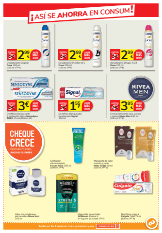 %u00a1AS%u00cd SE AHORRA EN CONSUM!Todo en tu Consum m%u00e1s pr%u00f3ximo y en consum.es299 3 %u20ac 55%u20acANTES:Desodorante Original Dove 200 ml (100 ml: 150 %u20ac)AHORAM%u00c1SBARATO 299 3 %u20ac 65%u20acANTES:Desodorante Invisible DryDove 200 ml (100 ml: 150 %u20ac)AHORAM%u00c1SBARATO 299 3 %u20ac 59%u20acANTES:Desodorante Dragon Fruit Dove 200 ml (100 ml: 150 %u20ac)AHORAM%u00c1SBARATO3%u20ac 395%u20acANTES:Dent%u00edfrico blanqueante o protecci%u00f3n diaria Sensodyne TUBO 75 ml (100 ml: 4 %u20ac)AHORAM%u00c1SBARATO 395 4 %u20ac 95%u20acANTES:Crema hidratante cara, cuerpo y manos Nivea Men 150 ml(100 ml: 263 %u20ac)AHORAM%u00c1SBARATODent%u00edfrico original Colgate Total 75 ml(100 ml: 387 %u20ac)Maquinilla desechableWilkinson Xtreme 3 4+4 gratis (la unidad: 074 %u20ac)155 1 %u20ac 85%u20acANTES:Dent%u00edfrico blanqueadorbicarbonato Signal100 mlAHORAM%u00c1SBARATODESCUENTO PARASOCIOS-CLIENTESCHEQUE CRECEAfter shave b%u00e1lsamopiel sensible Nivea Men100 mlGel fijador efecto mojado Fructis Style 250 ml(100 ml: 110 %u20ac)Mascarilla de color marr%u00f3n o rubioNelly TUBO 60 ml(100 ml: 465 %u20ac)