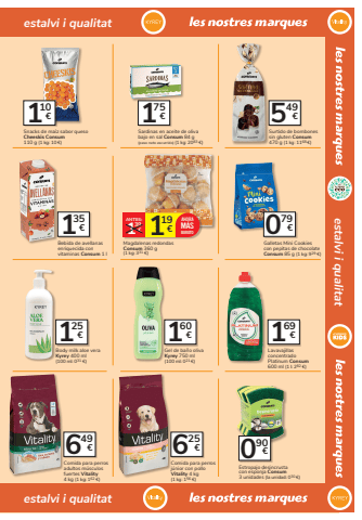 625%u20acComida para perros j%u00fanior con pollo Vitality 4 kg(1 kg: 156 %u20ac)160%u20acGel de ba%u00f1o oliva Kyrey 750 ml(100 ml: 021 %u20ac)175%u20acSardinas en aceite de oliva bajo en sal Consum 84 g (peso neto escurrido) (1 kg: 2083 %u20ac)135%u20acBebida de avellanas enriquecida con vitaminas Consum 1 l110%u20acSnacks de ma%u00edz sabor queso Cheeskis Consum110 g (1 kg: 10 %u20ac)079%u20acGalletas Mini Cookies con pepitas de chocolate Consum 85 g (1 kg: 929 %u20ac)549%u20acSurtido de bombonessin gluten Consum470 g (1 kg: 1168 %u20ac)649%u20acComida para perros adultos m%u00fasculos fuertes Vitality4 kg (1 kg: 162 %u20ac)119 1 %u20ac 39%u20acANTES:Magdalenas redondas Consum 360 g (1 kg: 331 %u20ac)AHORAM%u00c1SBARATO090%u20acEstropajo desincrusta con esponja Consum3 unidades (la unidad: 030 %u20ac)169%u20acLavavajillas concentrado Platinum Consum600 ml (1 l: 282 %u20ac)125%u20acBody milk aloe vera Kyrey 400 ml(100 ml: 031 %u20ac)estalvi i qualitatestalvi i qualitatestalvi i qualitat