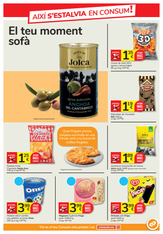 135 1 %u20ac 50%u20acANTES:Conos de ma%u00edz 3D%u2019s queso y bacon Lay%u2019s85 g (1 kg: 1588 %u20ac)AHORAM%u00c1SBARATO119 1 %u20ac 40%u20acANTES:Palomitas de chocolate Risi 100 g(1 kg: 1190 %u20ac)AHORAM%u00c1SBARATOSugerencia de presentaci%u00f3n189 2 %u20ac 09%u20acANTES:Aceitunas manzanilla sin hueso Jolca pack 3x50 g (peso neto escurrido)(1 kg: 1260 %u20ac)AHORAM%u00c1SBARATO399 5 %u20ac 19%u20acANTES:Dr%u00e1cula cola Frigopack 6x50 g (1 kg: 1330 %u20ac)AHORAM%u00c1S 3 BARATO99 4 %u20ac 99%u20acANTES:Magnum Euphoria Frigo pack 3x69,5 g (1 kg: 1914 %u20ac)AHORAM%u00c1SBARATO125 1 %u20ac 50%u20acANTES:Patatas fritas Churrer%u00eda Santa Ana140 g (1 kg: 893 %u20ac)AHORAM%u00c1SBARATO399 4 %u20ac 99%u20acANTES:Helado sabor vainilla con galletas al cacao Oreo 287 g (1 kg: 1390 %u20ac)AHORAM%u00c1SBARATOQuan tingues pressa, prepara una truita en uns minuts amb una bossa de cre%u00eflles fregides.Sugerencia de presentaci%u00f3nEl teu moment sof%u00e0AIX%u00cd S%u2019ESTALVIA EN CONSUM!Tot en el teu Consum m%u00e9s pr%u00f2xim i en consum.es