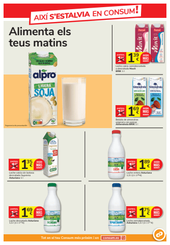 135 1 %u20ac 45%u20acANTES:Leche calcio sin lactosadesnatada SupremaAsturiana 1 lAHORAM%u00c1SBARATO139 1 %u20ac 59%u20acANTES:Leche calcio semidesnatada o desnatada MovitBRIK 1 lAHORAM%u00c1SBARATO189 1 %u20ac 99%u20acANTES:Leche entera Asturiana 1,5 l (1 l: 126 %u20ac)AHORAM%u00c1SBARATO169 1 %u20ac 79%u20acANTES:Leche desnatada Asturiana 1,5 l (1 l: 113 %u20ac)AHORAM%u00c1SBARATO 175 1 %u20ac 85%u20acANTES:Leche semidesnatada Asturiana 1,5 l (1 l: 117 %u20ac)AHORAM%u00c1SBARATO169 1 %u20ac 99%u20acANTES:Bebida de almendras original o sin az%u00facarAlmendrola BRIK 1 lAHORAM%u00c1SBARATOSugerencia de presentaci%u00f3nAlimenta els teus matinsAIX%u00cd S%u2019ESTALVIA EN CONSUM!Tot en el teu Consum m%u00e9s pr%u00f2xim i en consum.es