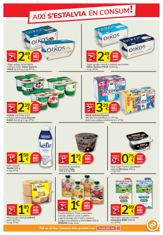 1%u20ac 119%u20acANTES:Pouche pl%u00e1tano, fresa y manzana,naranja, pl%u00e1tano, pera y galleta,yogur%u00edn griego con frutas y cookies o yogur con pl%u00e1tano y fresa Hero 100 g UNIDAD (1 kg: 10 %u20ac)AHORAM%u00c1SBARATO135 1 %u20ac 69%u20acANTES:Mousse de prote%u00ednas chocolate Valio150 g (1 kg: 9 %u20ac)AHORAM%u00c1SBARATO329 3 %u20ac 99%u20acANTES:PACK Actimel Danone0% 0% fresa 6x99 ml (1 l: 554 %u20ac)Kids fresa-pl%u00e1tano 8x94 ml (1 l: 438 %u20ac)AHORAM%u00c1SBARATO159 1 %u20ac 89%u20acANTES:K%u00e9fir natural Nestl%u00e9 500 g(1 kg: 318 %u20ac)AHORAM%u00c1SBARATO185 2 %u20ac 15%u20acANTES:Mousse de caf%u00e9 La Lechera pack 4x59 g(1 kg: 784 %u20ac)AHORAM%u00c1SBARATO 269 2 %u20ac 85%u20acANTES:Nata para cocinar o montar Asturiana BRIK 500 ml(1 l: 538 %u20ac)AHORAM%u00c1SBARATO249 2 %u20ac 99%u20acANTES:Yogur griego stracciatella o lima y lim%u00f3n Oikos DanonePACK 4x110 g (1 kg: 566 %u20ac)AHORAM%u00c1SBARATO 249 2 %u20ac 99%u20acANTES:Yogur griego natural o natural azucaradoOikos Danone PACK 4x110 g (1 kg: 566 %u20ac)AHORAM%u00c1SBARATO075 0 %u20ac 89%u20acANTES:Skyr High Protein desnatado natural Ehrmann 150 g(1 kg: 5 %u20ac)AHORAM%u00c1SBARATO239 2 %u20ac 99%u20acANTES:Activia con fresa, pera o frutos del bosque Danone PACK 4x120 g (1 kg: 498 %u20ac)AHORAM%u00c1SBARATOAIX%u00cd S%u2019ESTALVIA EN CONSUM!Tot en el teu Consum m%u00e9s pr%u00f2xim i en consum.es