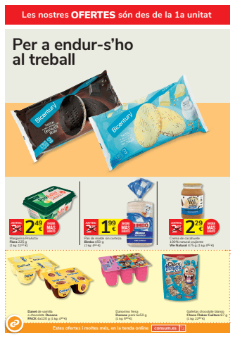 229 2 %u20ac 69%u20acANTES:Crema de cacahuete 100% natural crujiente We Natural 475 g (1 kg: 482 %u20ac)AHORAM%u00c1S 1 BARATO99 2 %u20ac 35%u20acANTES:Pan de molde sin corteza Bimbo 450 g(1 kg: 442 %u20ac)AHORAM%u00c1SBARATODanet de vainilla o chocolate DanonePACK 4x120 g (1 kg: 415 %u20ac)Danonino fresa Danone pack 6x50 g (1 kg: 563 %u20ac)Galletas chocolate blancoChoco Flakes Cu%u00e9tara 87 g(1 kg: 2287 %u20ac)249 3 %u20ac 09%u20acANTES:Margarina ProActiv Flora 225 g(1 kg: 1107 %u20ac)AHORAM%u00c1SBARATOPer a endur-s%u2019ho al treballLes nostres OFERTES s%u00f3n des de la 1a unitatEstes ofertes i moltes m%u00e9s, en la tenda online consum.es