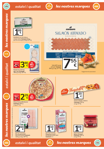 189%u20acSardines en oli d%u2019olivaverge extra Consum 84 g(pes net escorregut) (1 kg: 2250 %u20ac)755 noruec SALM%u00d3 Consumfumat %u20ac200 g (1 kg: 3775 %u20ac)229 2 %u20ac 50%u20acABANS:Pizza fresca Barbacoa Consum 400 g(1 kg: 573 %u20ac)ARAM%u00c9SBARAT390 4 %u20ac 19%u20acABANS:Rodanxes de llu%u00e7del Cap Consum360 g (1 kg: 1083 %u20ac)ARAM%u00c9SBARAT260%u20acPit de gall dinditall xarcuteria Consum140 g (1 kg: 1857 %u20ac)110%u20acBeguda d%u2019arr%u00f2senriquida amb calciConsum 1 l120%u20acPasta fullada rodonaConsum 230 g(1 kg: 522 %u20ac)169%u20acSalsa Mexican Consum 305 g(1 kg: 554 %u20ac)Suggeriment de presentaci%u00f3calidad y ahorroestalvi i qualitatestalvi i qualitatestalvi i qualitat* Dades obtingudes a partir de panel o panels de consumidors.