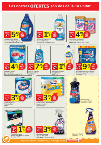 199 3 %u20ac 79%u20acABANS:Suavitzant concentrat Blau vital Mimos%u00edn 56 rentades (la rentada: 004 %u20ac)ARAM%u00c9S 5 BARAT39 7 %u20ac 95%u20acABANS:Detergent gel NetejaProfunda Wipp Express28 rentades (la rentada: 019 %u20ac)ARAM%u00c9SBARAT 449 5 %u20ac 99%u20acABANS:Llevataques roba blanca o color Oxi Action Gold Vanish POT 400 g (1 kg: 1123 %u20ac)ARAM%u00c9SBARAT499 8 %u20ac 79%u20acABANS:Detergent 4 en 1 Trio Caps Dixan24 rentades (la rentada: 021 %u20ac)ARAM%u00c9SBARATLlevagreix Asevi750 ml (1 l: 399 %u20ac)399 5 %u20ac 59%u20acABANS:Rotlle multiusos Tornado Blau FoxyARAM%u00c9SBARATLes nostres OFERTES s%u00f3n des de la 1a unitatAquestes ofertes i moltes m%u00e9s, a la botiga online consum.es199 2 %u20ac 69%u20acABANS:Rentaplats original Mistol 900 ml(1 l: 221 %u20ac)ARAM%u00c9SBARAT399 4 %u20ac 99%u20acABANS:Netejador brut%u00edcia i taques d%u2019humitatCillit Bang 750 ml (1 l: 532 %u20ac)ARAM%u00c9S 1 BARAT59 1 %u20ac 79%u20acABANS:Tovallons 2 capesHappy Hour Foxy 50 unitats (la unitat: 003 %u20ac)ARAM%u00c9SBARAT319 3 %u20ac 89%u20acABANS:Paper higi%u00e8nic Foxy Mega3 paquet 4 rotlles (el rotlle: 080 %u20ac)ARAM%u00c9SBARAT725 8 %u20ac 99%u20acABANS:Antical%u00e7 gel 4en1 Calgon 750 ml (1 l: 967 %u20ac)ARAM%u00c9SBARATAbrillantadorrentaplats Finish500 ml (1 l: 980 %u20ac)999 14 %u20ac 99%u20acABANS:Rentaplats m%u00e0quina c%u00e0psulesFinish Quantum 68 rentades (la rentada: 015 %u20ac)ARAM%u00c9SBARAT