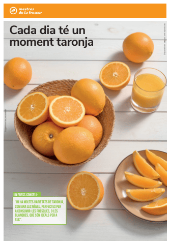 Disponible en botigues amb el producte.Suggeriment de presentaci%u00f3.Cada dia t%u00e9 un moment taronja%u201cHI HA MOLTES VARIETATS DE TARONJA, COM ARA LES N%u00c0VEL, PERFECTES PER A CONSUMIR-LES FRESQUES, O LES BLANQUES, QUE S%u00d3N IDEALS PER A SUC%u201d.UN FRESC CONSELL:
